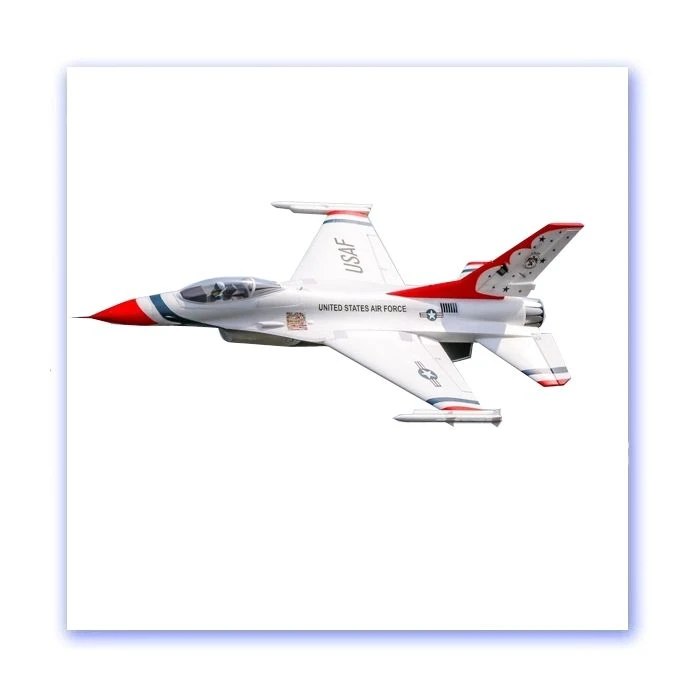 The E-flite F-16 Thunderbirds 70mm EDF jet is a replica of the iconic aircraft flown by the U.S. Air Force Thunderbirds. Like the full-scale airshow thriller, this F-16 has an incredibly wide flight performance envelope-from slow and stable high-alpha flight to amazing high-speed and vertical capabilities. At its core is a 6S-compatible brushless motor and a 70-amp ESC that are matched to a 12-blade fan to deliver an abundance of speed, thrust and a turbine-like sound. Factory-installed electric retracts with shock-absorbing struts make it possible to take off and land on a wider variety of surfaces-including grass-while keeping ground handling smooth and delivering a realistic jet experience. The composite reinforced EPO airframe is lightweight yet strong, and the digital, metal-geared servos plus ball-link equipped linkages provide precise control. And it all combines to deliver one of the easiest to fly yet highest-performance and most capable F-16 models ever!