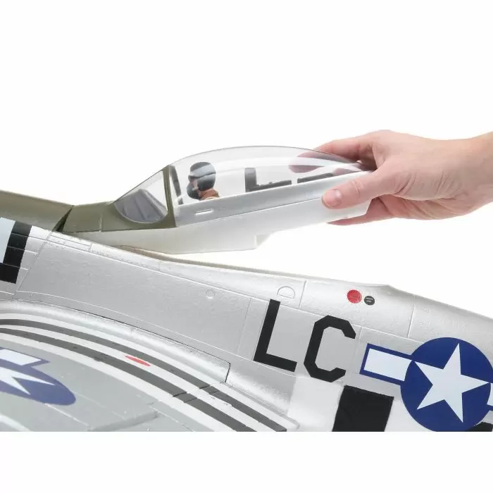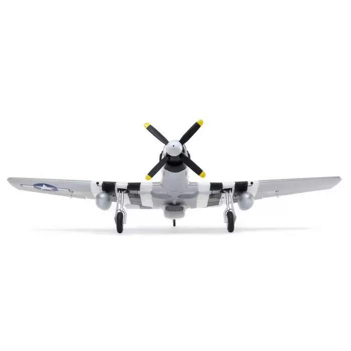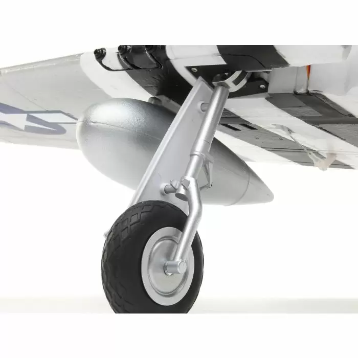 The E-fliteยฎย P-51D Mustang 1.2m scale airplane delivers outstanding warbird appeal whether flying or just standing still. The realistic four-blade propeller, outline and cockpit detail highlight the devoted attention given to pull off a popular subject like the Mustang this well. Its functional flaps feature the precision of independent servo operation while electric retractable main landing gear provides reliability and scale-like movement. Construction with EPO foam keeps the overall weight low while maintaining a level of durability that makes flying a scale sensation, like this Mustang, practical enough to enjoy every day. The installed power system offers outstanding performance when used with a 3S LiPo battery. Go beyond ballistic and fly with 4S powerโno equipment change required. Whether you’re an intermediate or advanced pilot, the P-51D Mustang 1.2m has the detail, the heart-stopping performance and more importantly the flight quality you need to experience what piloting a legendary thoroughbred is all about.