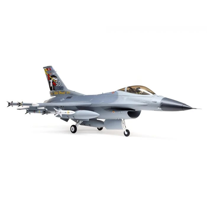 The E-fliteยฎ F-16 Falcon 80mm EDF jet is the Smartest, most detailed and best handling high-performance replica of the world-renowned fighter yet! Extra Scale details, including molded-in panel lines, simulated antennas, indicators, sensors, optional-use ordnance, and more take realism to the next level. Functional Extra Scale features include LED navigation and landing lights, full-flying stabs, sequenced gear doors plus the most scale-like retractable landing gear installed on an F-16 EDF model yet. Both versions include nine factory-installed digital, metal-geared servos, and with the ARF Plus version you can install the compatible receiver and an 80mm EDF power system of your choice โ from another similar class model or using other compatible components. The BNFยฎ Basic version comes factory-equipped with a Spektrumโข AR637TA receiver that includes exclusive AS3Xยฎ and optional-use SAFEยฎ Select technologies, along with a V2 12-blade 80mm fan, high-power 2100Kv brushless inrunner motor and a 100-amp Avianโข Smart ESC to deliver fantastic performance with popular 6S 4000โ7000mAh LiPo batteries. This efficient power system provides better performance and longer flight times than the 6S-compatible power systems used in similar sized models powered by 90mm EDFs. The ESC and receiver supply real-time battery voltage, motor RPM and other telemetry data via compatible transmitters. Constructed of durable, fully-molded EPO, this F-16 assembles without glue and can be ready to fly in less time than other similar class models!