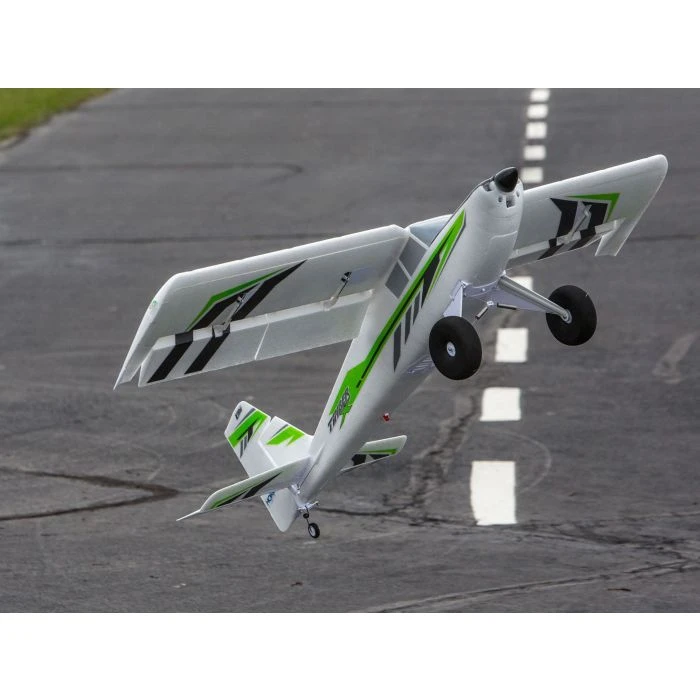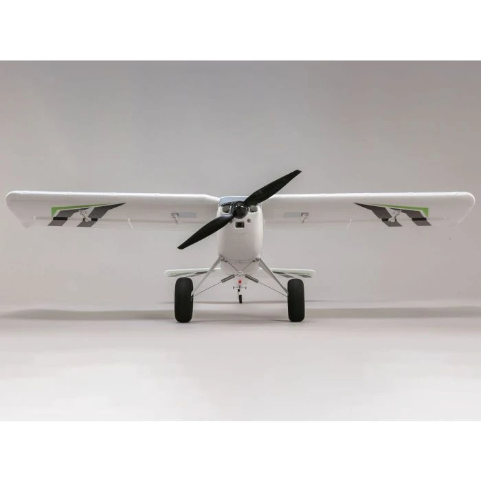 The new wing design has a shorter span yet almost as much wing area as the original, plus it features drooped wingtips and can be equipped with the included optional-use leading edge slats for improved slow flight and STOL performance. These features, along with the lightweight design, oversized flaps and high-power brushless motor make it possible to spring into the air or float down to land in as little as two feet or less.