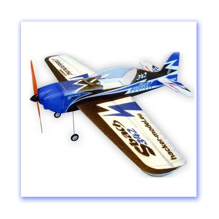 This is the MINI Sbach 342 ARF from Hacker and if you want an EPP plane but hate profiles this is for you. It is perfect for indoor or outdoor aerobatics or pylon racing. It is a high performance semi-scale model featuring a full fuselage with Carbon Rods in the wings to make the Sbach 342 stays rock solid in flight and durable over many flights. Also, the full fuselage makes the plane stiffer than its profile counterparts. The plane is CNC cut from “almost unbreakable” EPP foam and can be assembled in 1 or 2 evenings. There are no decals to apply, it is painted with a special CAD process for scale details never before possible in EPP models. The all-EPP Foam construction makes it tough to damage. Even if you crash the airplane and the EPP breaks, it breaks cleanly, which allows you to repair it with CA glue in few minutes. Like all of the Hacker planes, this one has a real airfoiled wing. No flat plate foamies here.