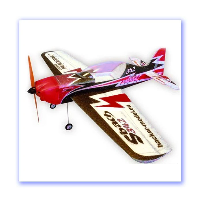 This is theย MINI Sbach 342 ARF from Hacker and if you want an EPP plane but hate profiles this is for you. It is perfect for indoor or outdoor aerobatics or pylon racing. It is a high performance semi-scale model featuring a full fuselage with Carbon Rods in the wings to make the Sbach 342 stays rock solid in flight and durable over many flights. Also, the full fuselage makes the plane stiffer than its profile counterparts. The plane is CNC cut from “almost unbreakable” EPP foam and can be assembled in 1 or 2 evenings. There are no decals to apply, it is painted with a special CAD process for scale details never before possible in EPP models. The all-EPP Foam construction makes it tough to damage. Even if you crash the airplane and the EPP breaks, it breaks cleanly, which allows you to repair it with CA glue in few minutes. Like all of the Hacker planes, this one has a real airfoiled wing. No flat plate foamies here.