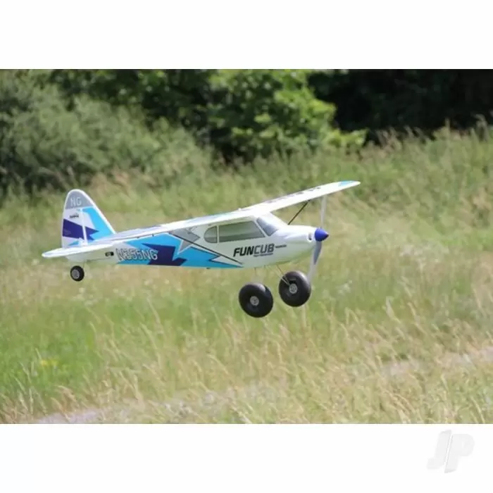 Key Features Flap-equipped. Spectacular STOL capability. Light and tough Elapor foam construction. Fully aerobatic flight envelope. Stylish new trim scheme available in two colour options (blue and green). Transport-friendly with removable wings. Makes a perfect basic trainer. Equipped with tundra tyres for all-terrain operation. Easy battery change through canopy hatch. Optional floats and glider tow release mechanism. Beautifully engineered. What’s in the Box 1x 95 percent complete, pre-decorated (blue) FunCub airframe. 1x Powerful Roxxy C 35-42-930 brushless motor (pre-installed). 1x Roxxy 740S-BEC brushless ESC (pre-installed). 1x 13 x 4″ APC-E propeller. 1x Comprehensive instruction manual. 2 x Hitec HS-65HB servos (pre-installed). 4 x Hitec HS-55 servos (pre-installed). Product Description Eagerly awaited, the new NG (next generation) FunCub is here and, hard as it is to believe, the flight characteristics and handling of this practical favourite have been further improved. Light, strong and delightfully agile, the good-natured NG is now the perfect multi-role club machine with an ability to satisfy a variety of specific wish list requirements. Boasting an outstanding STOL and training capability, right up to a fully aerobatic flight envelope that includes knife-edge manoeuvres and prop-hanging, the FunCub NG just keeps giving. Large tundra wheels make it suitable for almost all flying fields, it’s a capable glider tug and, what’s more, with the optional float set it becomes a hugely competent waterplane. Sporting the same 1400mm wingspan as its predecessor the convenient two-piece wing has a strut option for aerobatic flight whilst the fuselage core has been redesigned, not least to accommodate a handy easy-load forward battery hatch. Suitable for young, not so young, fledgling pilots and top guns alike, the FunCub NG is a model with the versatility to please all. You need one. Specification: Wingspan (mm): 1410 All-up weight (g): 1380 Flight duration (mins): 8 Rec’d Flight Battery (LiPo): 3S 2600mAh R/C channels: 5