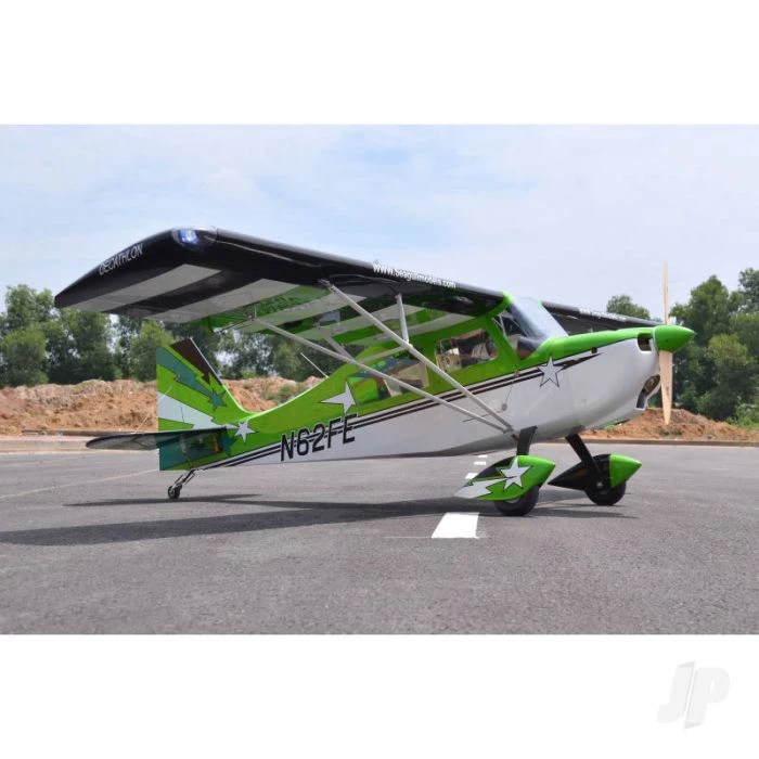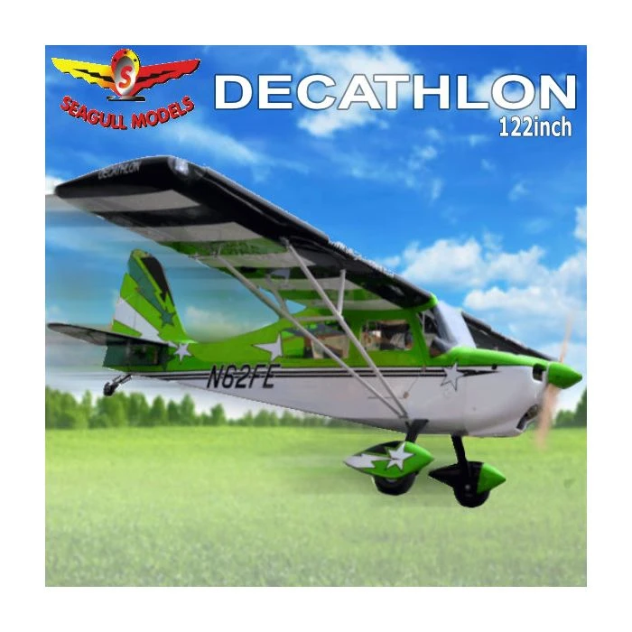 Modelled on Xtreme Decathlon N62FE, beautifully detailed and with an impressive 122” wingspan, Seagull has excelled itself with this large scale fully aerobatic 60-80cc aerobat. Fully stressed for advanced and 3D aerobatics this beautifully finished model comes built and covered to Seagull’s exacting standards, with some lovely scale touches to boot. Look forward to a hinged cockpit door, scale struttery, beautifully painted and finished glass fibre parts (including cowl and spats), acres of cockpit space, a fully sprung tail wheel, lights, flaps, bracing wires, fixtures, fittings and soft furnishings… Okay, scratch the soft furnishings. Anyway, you get the idea, Seagull’s 60-80cc Decathlon is a lovely, lovely thing.